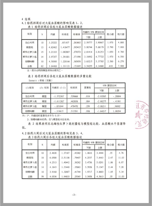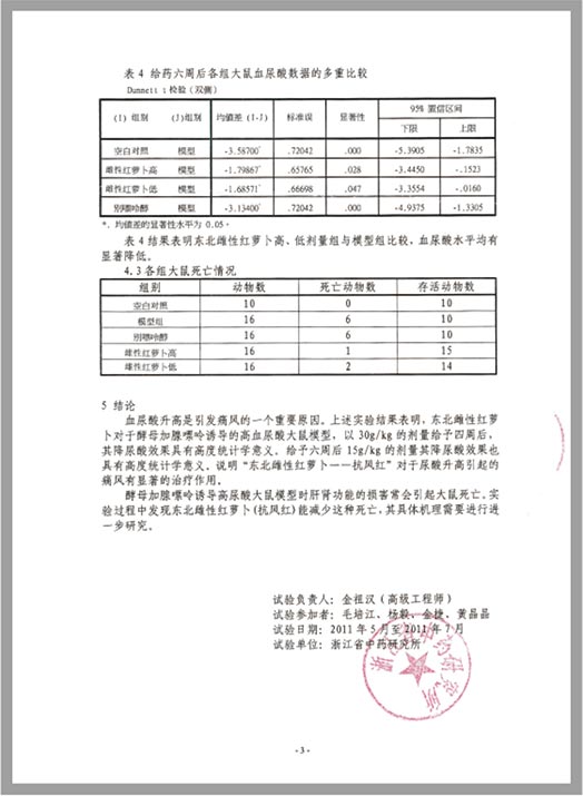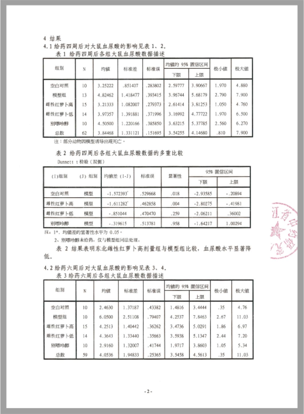 結(jié)論:血尿酸升高是引發(fā)痛風(fēng)的一個重要原因。實驗結(jié)果表明,東北雌性紅蘿卜對于酵母加腺嘌呤誘導(dǎo)的高血尿酸大鼠模型,以30g/kg的劑量給予四周后,其降尿酸效果具有高度統(tǒng)計學(xué)意義。說明“抗風(fēng)紅·東北雌性紅蘿卜”對于尿酸升高引起的痛風(fēng)具有顯著的作用。